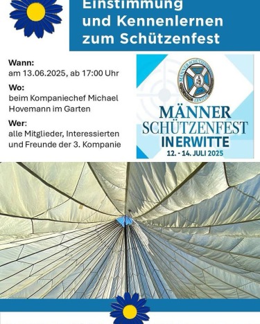 Michael Hovemann lädt dazu alle neu eingetretenen Kompaniemitglieder sowie alle Mitglieder der Dritten und Freunde der Kompanie zur Einstimmung unter dem Fallschirm in seinem Garten ein.