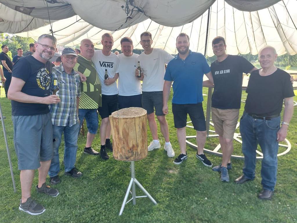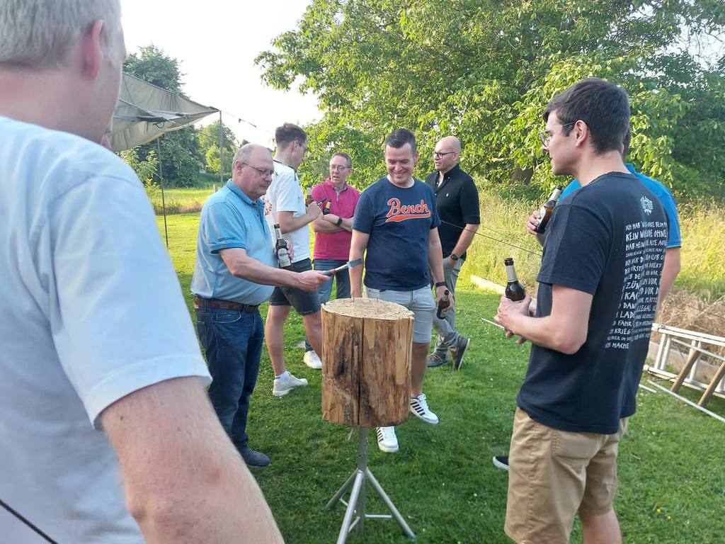 Bei kühlen Getränken und Leckereien vom Grill kam unter dem großen Fallschirm schnell gute Stimmung auf. Hierzu trug auch der traditionelle Nagelbalken bei. So feierten alle bei sommerlichen